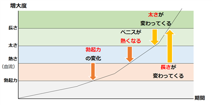 そこから少しづつ膨張率が上がって、勃起したときに異常にペニスが熱く感じられ、まずは太さや血管が浮き出てくるのが体感できるはずです。この時期のオナニーやSEXは服用してないときより気持ちいいはずです。