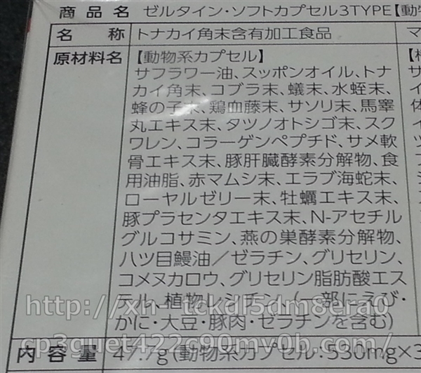 サフラワー油、すっぽんオイル、トナカイ角末、コブラ末、蟻末、水蛭末、蜂の子末、鶏血藤末、サソリ末、馬睾丸エキス末、タツノオトシゴ末、スクワレン、コラーゲンペプチド、サメ軟膏エキス末、豚肝臓酵素分解物、食用油脂、赤マムシ末、エラブ海蛇末、ローヤルゼリー末、牡蠣エキス末、豚プラセンタエキス末、Nーアセチルグルコサミン、燕の巣酵素分解物、八ツ目鰻油/ゼラチン、グリセリン、コメヌカロウ、グリセリン脂肪酸エステル、植物レシチン |