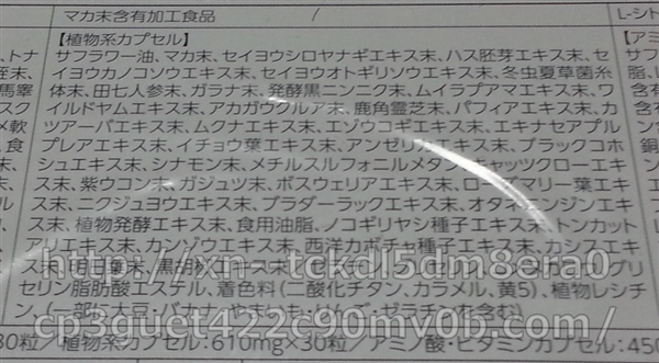 サフラワー油、マカ末、セイヨウシロヤナギエキス、ハス胚芽エキス末、セイヨウカノコソウエキス末、セイヨウオトリギソウエキス末、冬虫夏草菌糸体末、田七人参末、ガラナ末、発酵黒ニンニク末、ムイラプアマエキス末、ワイルドヤムエキス末、ムクナエキス末、エゾウコギエキス末、エキナセアプルプレアエキス末、シナモン末、メチルスルフォニルメタン、キャッツクローエキス末、紫ウコン末、ガジュツ末、ボスウェリアエキス末、ローズマリー葉エキス末、ニクジュヨウエキス末、ブラダーラックエキス末、オタネニンジンエキス末、植物発酵エキス末、食用油脂、ノコギリヤシ種子エキス末、トンカットアリエキス末、カンゾウエキス末、西洋カボチャ種子エキス末、カシスエキス末、明日葉末、黒胡椒エキス末、ゼラチン、クリセリン、コメヌカロウ、グリセリン脂肪酸エステル、植物レシチン |