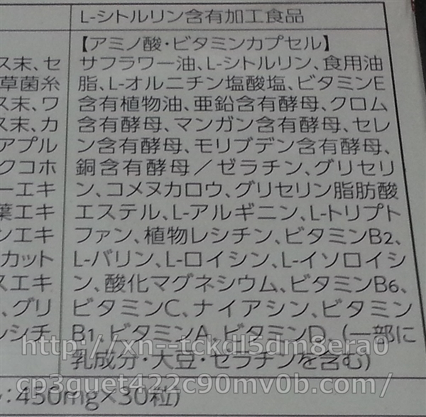 サフラワー油、Lーシトルリン、食用油脂、Lーオルニチン塩酸塩、ビタミンE含有植物油、亜鉛含有酵母、クロム含有酵母、マンガン含有酵母、セレン含有酵母、モリブデン含有酵母、銅含有酵母、ゼラチン、グリセリン、コメヌカロウ、グリセリン脂肪酸エステル、Lーアルギニン、Lートリプトファン、植物レシチン、ビタミンB2、Lーバリン、Lーロイシン、Lーイソロイシン、酸化マグネシウム、ビタミンB6、ビタミンC、ナイアシン、ビタミンB1、ビタミンA、ビタミンD |