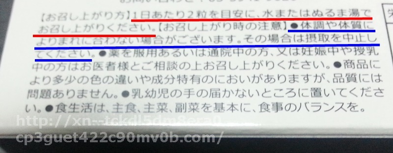 「1日あたり2粒を目安に、水またはぬるま湯でお召し上りください。」