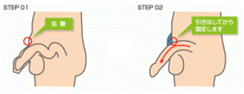 A勃起させたペニスの根元部分を親指と人差し指で握る。