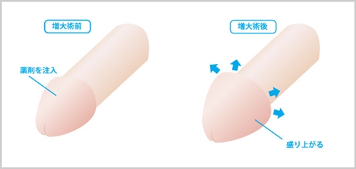 アクアミドやヒアルロン酸、コラーゲンなどを注入する増大術です。ちなみにこれは上記2つとは違い、永久に続くものではありません。個人差はありますが、5〜6年と言われています。また、経験の少ないドクターによっては皮膚が硬くなったり、最悪壊死してしまう事もあるようです。