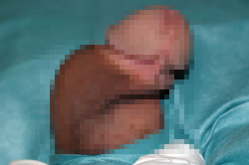 下の写真がその、「小陰茎症」の方の写真です。これ、勃起した状態なんです。モザイクのせいでわかりづらいかもしれませんが、おおよその形、大きさはわかるのではないでしょうか。