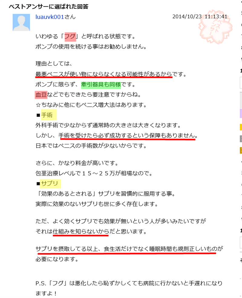 こうなってしまうのに多い事例が、【ペニス増大器具】の使い過ぎによるものです。特に、「ミスターハイ」という吸引ポンプによる事例が多く、ミスターハイ使用者は100%に近い確率でペニスがフグってしまいます。