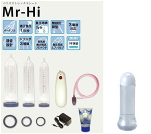 器具の内部から空気を抜き出し、そしてペニスに強引に血液を送り込むことで増大を図ろうという器具です。下の写真の左側のシリンダーに自身のペニスを装着し、ポンプでシリンダーを真空状態にしてペニスを引っ張り出す器具です。