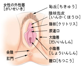 最初は基本を確認しましょう。もちろん多くの男性がご存知のように、女性器の一番上位、大陰唇(外側のヒダヒダ)を左右に分けて、その上にある小さな突起物がクリトリスです。下の図に「陰核」とありますね。簡単に言えば